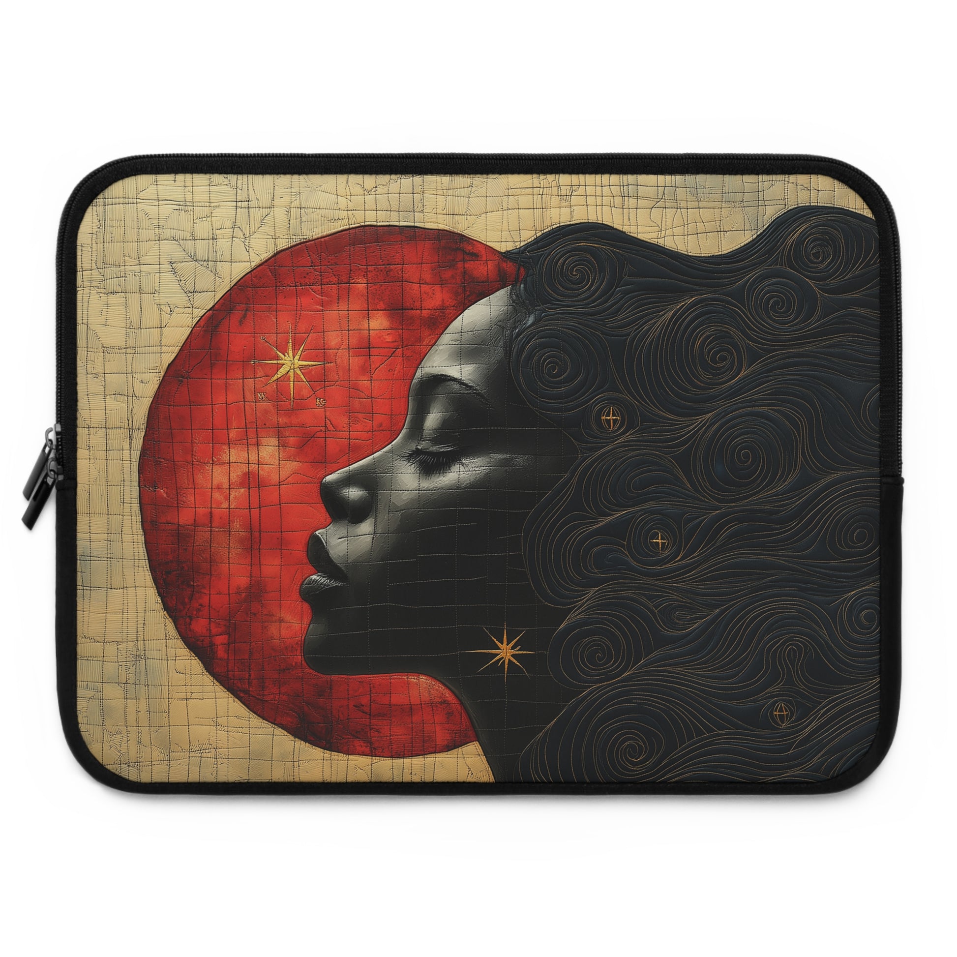 Alignment evokes a deep inner peace born from surrendering to the universal current. Waves of hair roll like an ocean tide, reflecting the quiet harmony of inner and outer worlds. A crimson moon rises in tandem, not to dominate, but to affirm her place in the cosmic order. There is no resistance here; only trust, flow, and perfect stillness within motion.