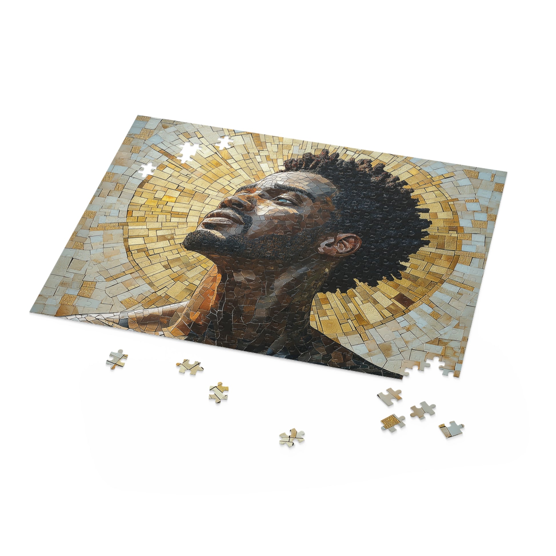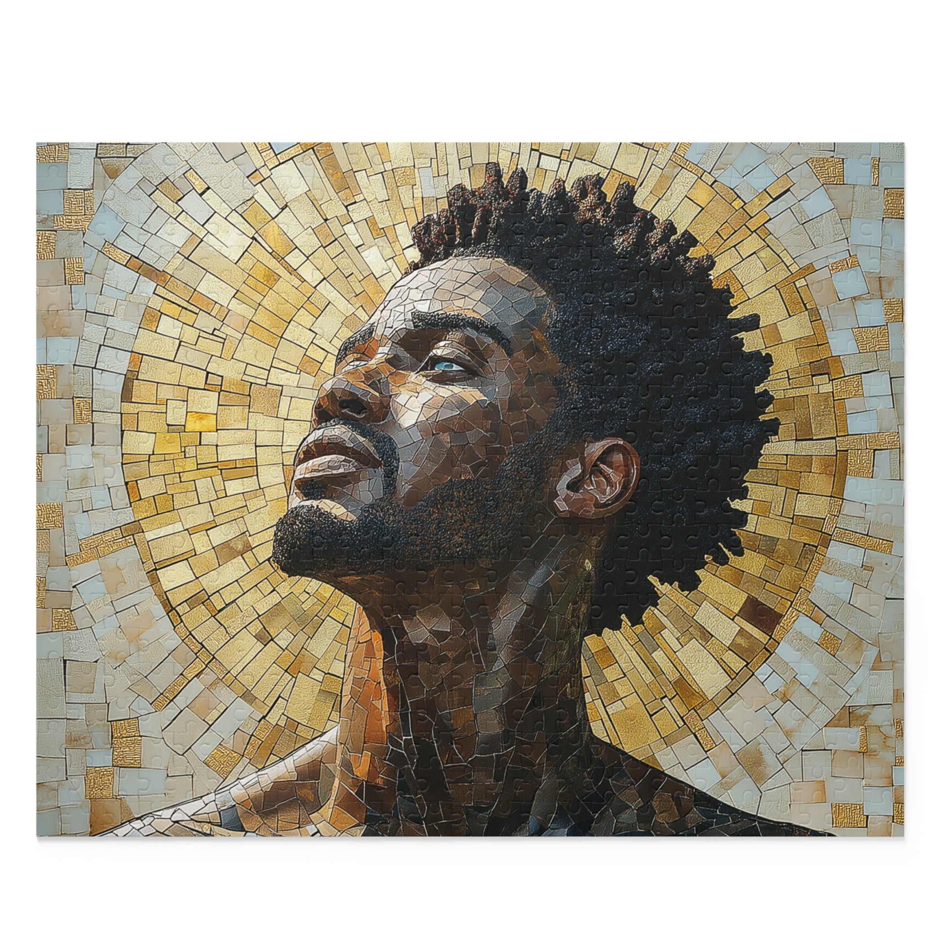 He rises not from glory, but from grit. Every shard across his form tells of trials survived, histories unspoken, and burdens carried. The radiant crown behind him isn’t decorative; it’s earned. He is the artifact of struggle, the light cast by resilience. Ascendant Remnant is the embodiment of quiet triumph; a man rebuilt by memory, rising with purpose. Not what was broken, but what refused to stay down. An Afrocentric mosaic portrait celebrating resilience and transformation.