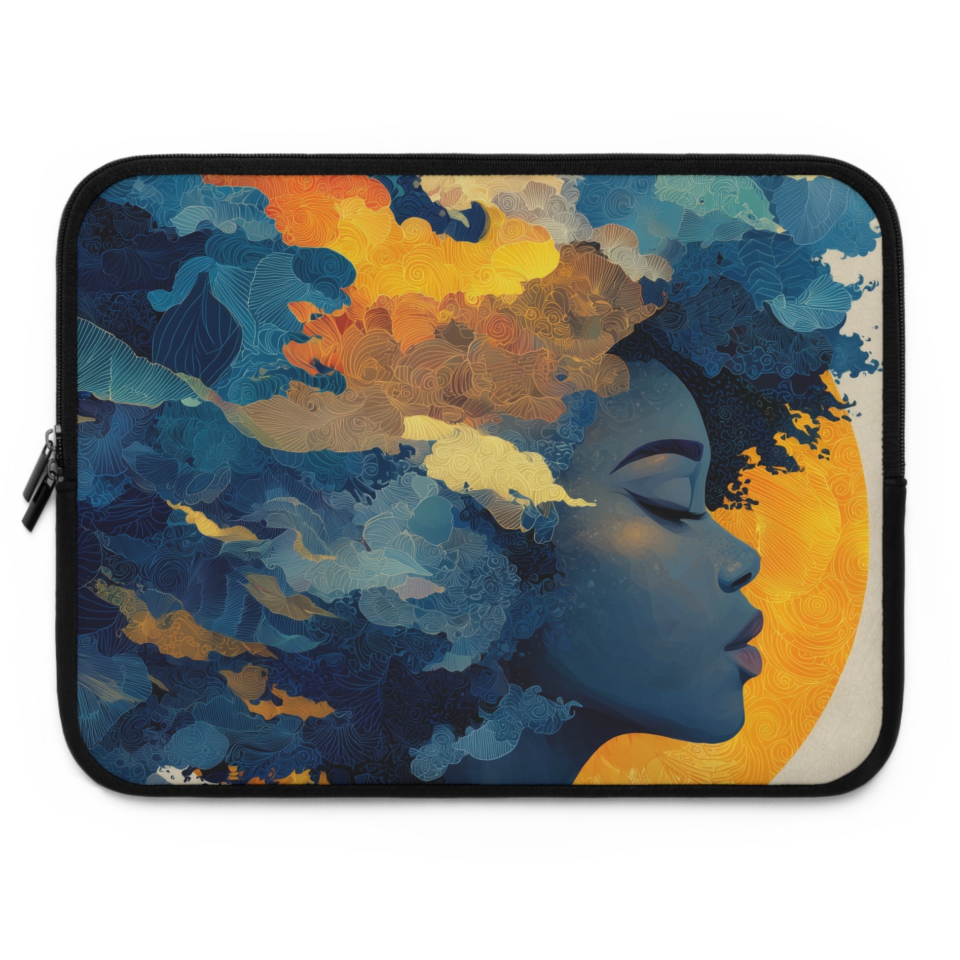A tranquil profile drifts in cobalt clouds while a honeyed halo steadies the breath.
