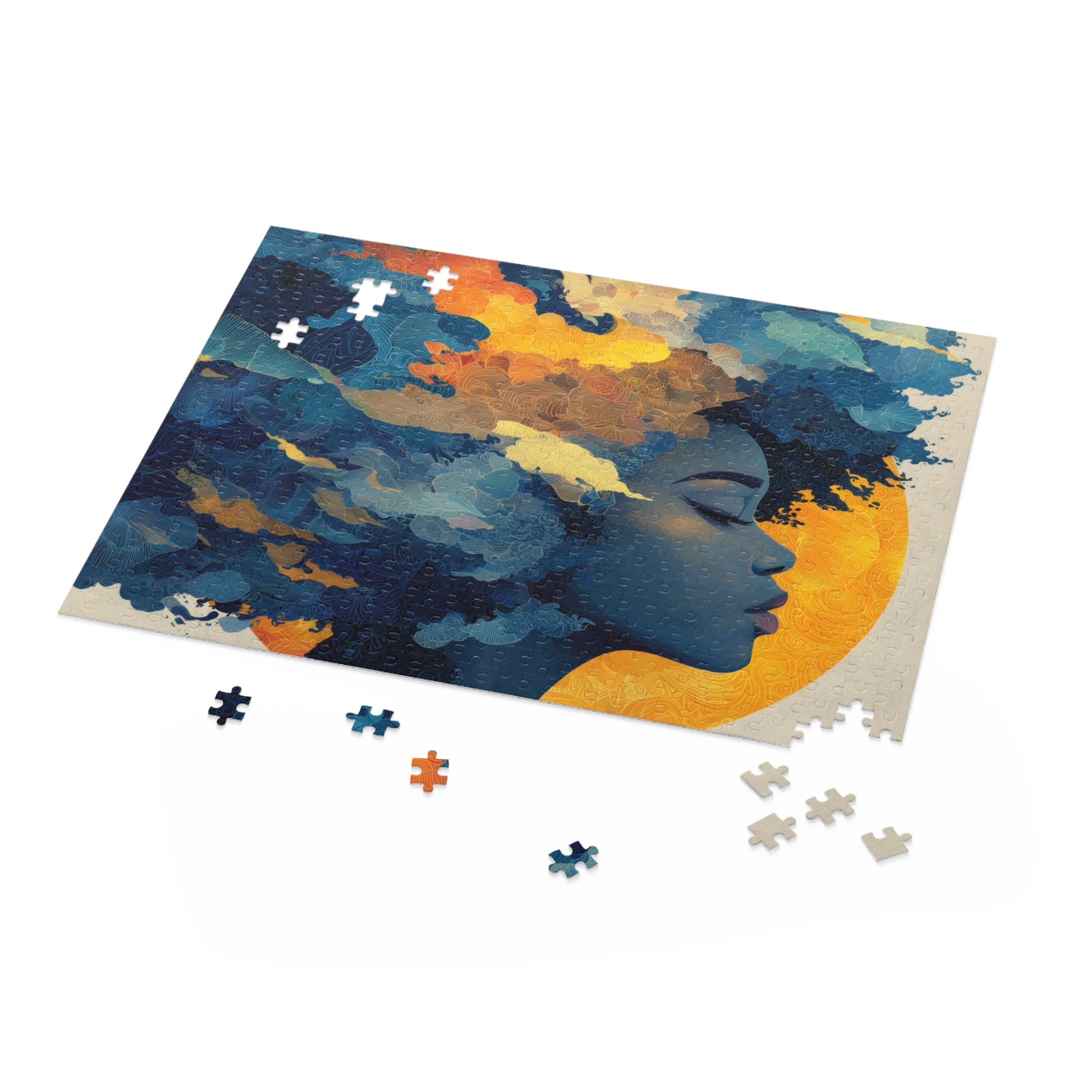 A tranquil profile drifts in cobalt clouds while a honeyed halo steadies the breath.