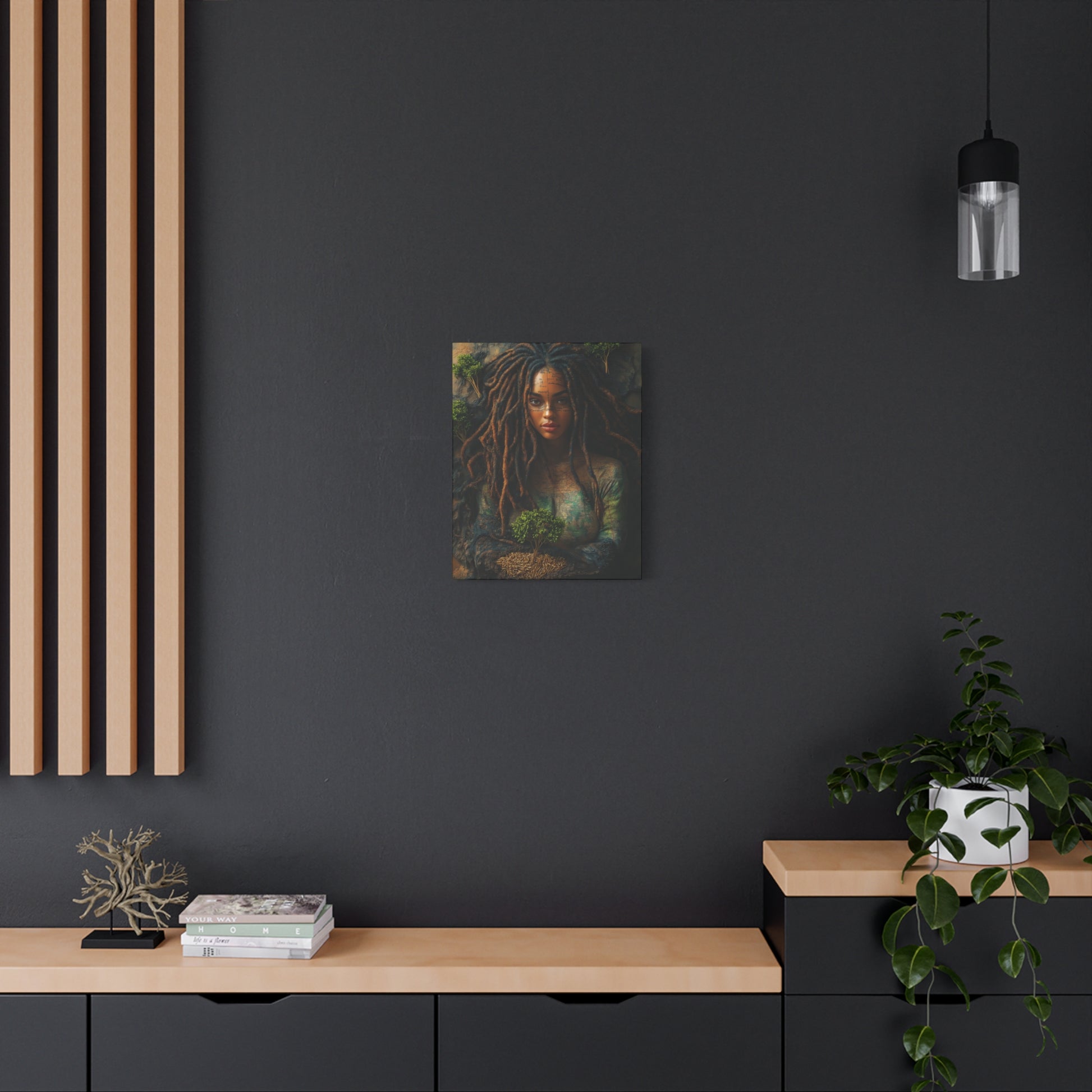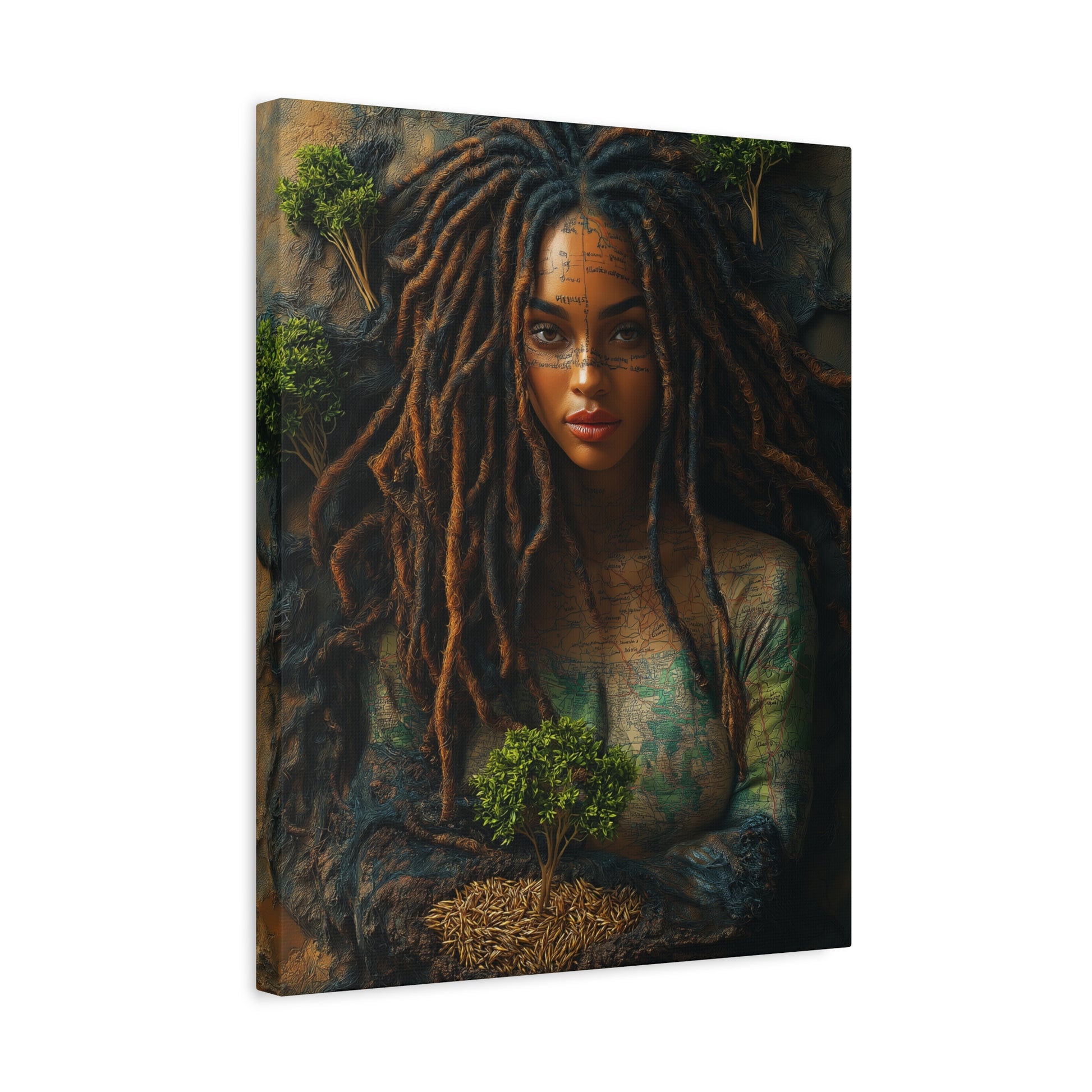Terra Tethered is a portrait of rooted belonging. Her skin carries the blue of rivers, the lines of ancient roots, the unmarked trails of those who walked before. She is both map and memory — geography made flesh. Here, earth is not backdrop but bloodline, and her gaze holds the weight of every place that shaped her.