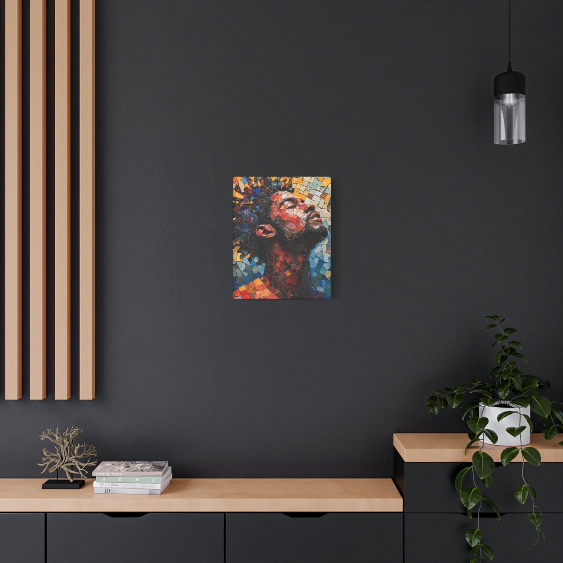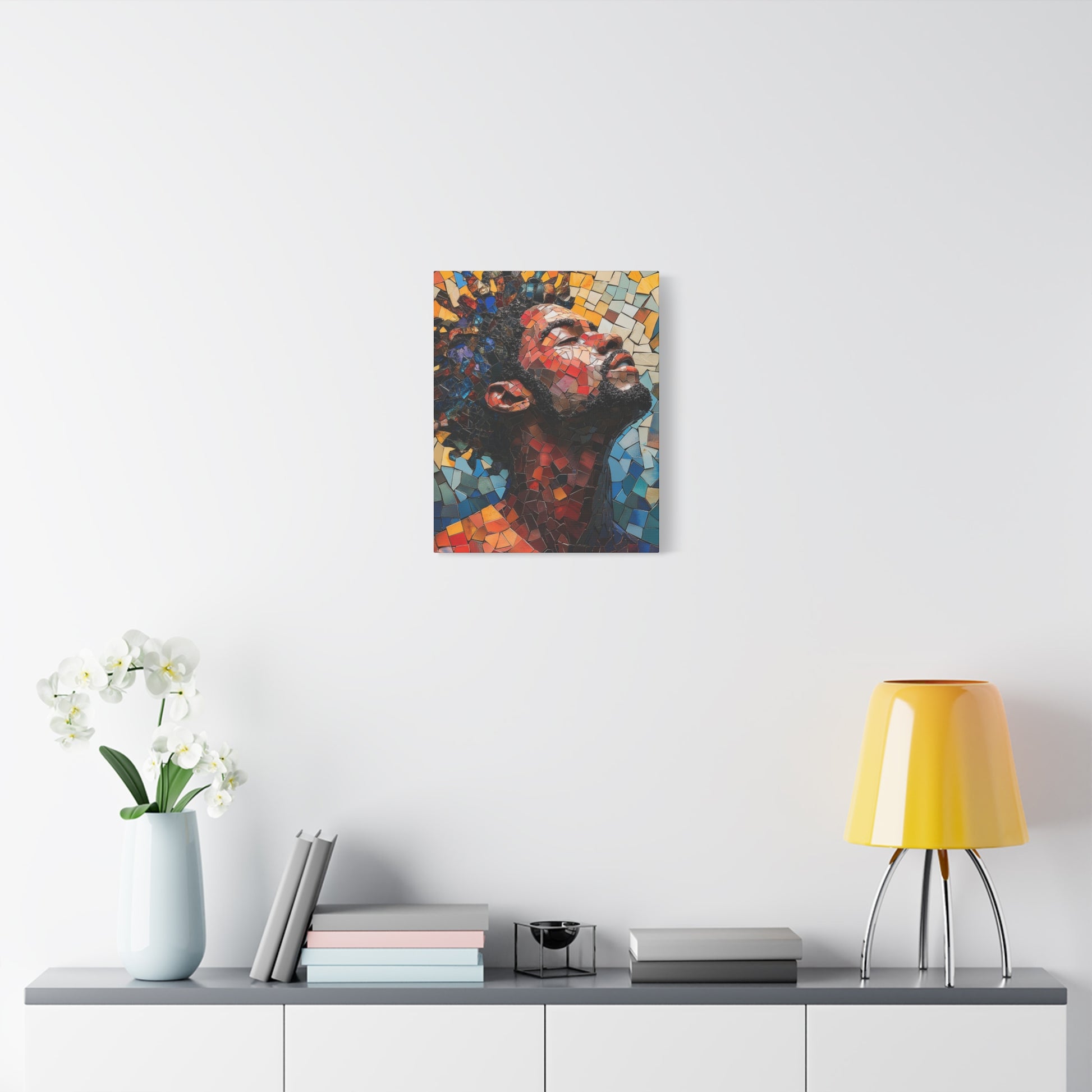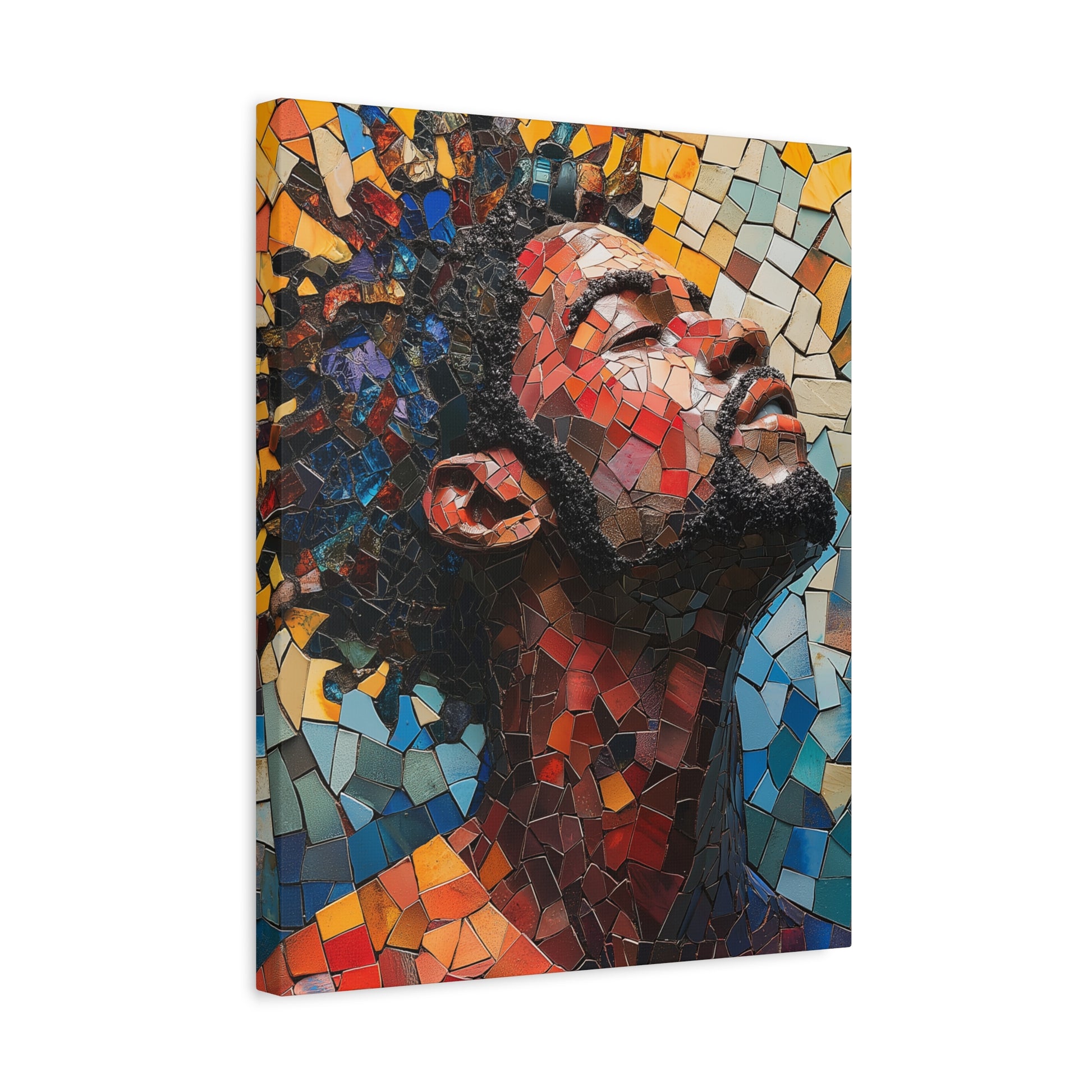Shattered but not silenced, Prism Wound is a portrait of pain transformed. The face is ablaze with kaleidoscopic tension, where every crack in the mosaic becomes a vein of light. His upward gaze suggests not surrender but evolution; a moment between agony and artistry. This is not about hiding wounds; it’s about weaponizing them with brilliance. An Afrocentric mosaic portrait of transformation through adversity.